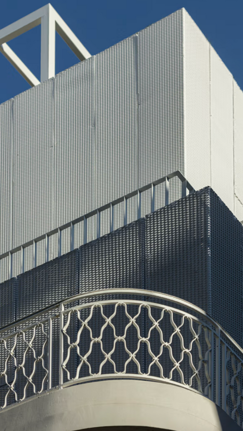 The project is distinguished by its perforated aluminium facade, which serves as a "veil" to mitigate the starkness of the addition's shapes, simultaneously obscuring and revealing. This double-skin façade fulfils both functional and aesthetic roles, enhancing natural ventilation and seclusion while enabling dynamic light reflection from its surface. The exterior features adjustable louvres and revolving panels, producing a "kinetic sculpture" look, where changing transparency engage with sunlight to produce a light, ethereal aesthetic.