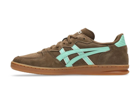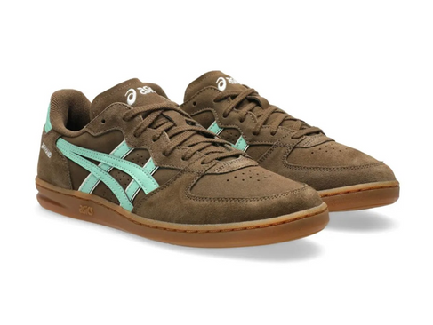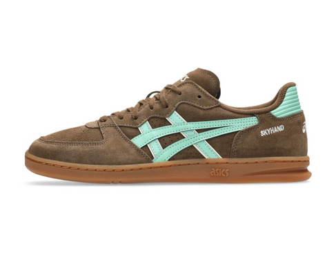 The ASICS Skyhand OG, a reinterpreted classic handball style from the 1990s, has been released in a new and modern "Brown Storm/Ice Green" colourway. The upper is predominantly constructed from high-quality suede, showcasing a profound 'Brown Storm' shade that offers a luxurious, amber-like base for the sneaker. The earthy base is dramatically contrasted by the distinctive ASICS Tiger Stripes on the quarters, rendered in an electrifying “Ice Green” to produce a startling, high-contrast appearance. The design preserves its nostalgic essence with a low-profile structure, employing tonal laces and a cushioned tongue adorned with classic ASICS branding for a polished, unified appearance.