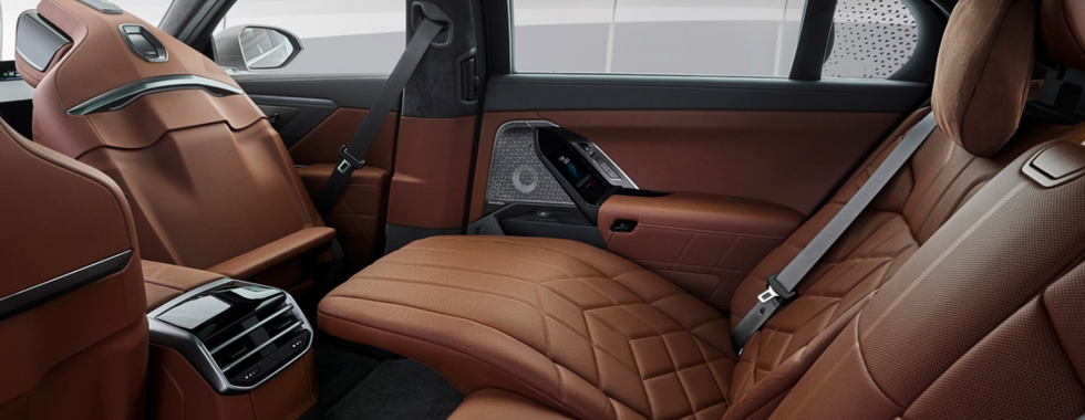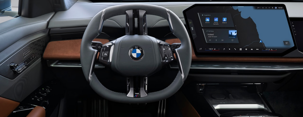 The interior of the 7-series emphasises digital luxury. The focal point for rear passengers is the BMW Theatre Screen – a 31.3-inch, 8K panoramic display that retracts from the headliner, transforming the cabin into a private mobile cinema. Upon deployment, the driver receives a digital rearview, providing an unobstructed vision of the rear, free from the obstruction of the large display. The cockpit for the driver is anchored by a reengineered steering wheel, characterised by a simple form and tactile touch controls that interact with the new Panoramic iDrive system. BMW created an expansive windshield-mounted heads-up display (HUD) and eliminated the traditional gauge cluster, resulting in the introduction of a novel vertical-spoked design. Finally, the digital controls for every passengers are located on their armrest, ensuring optimal convenience of control.