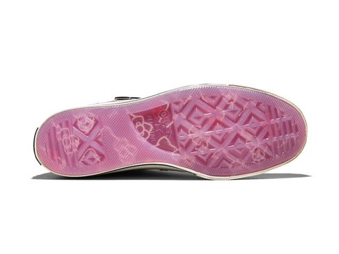 Vibrant pink accents are subtly incorporated into the shoe, contrasting with the neutral basis, and are present on the midsole piping, internal lining, and translucent outsole. A diminutive, delightful bow is integrated immediately into the toe cap, while the heel replaces Converse's standard vintage logo with a striking Hello Kitty motif. The sneaker features a removable hangtag charm that combines a Converse All Star emblem with a bespoke crystal Hello Kitty piece.