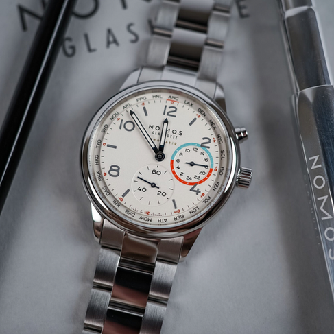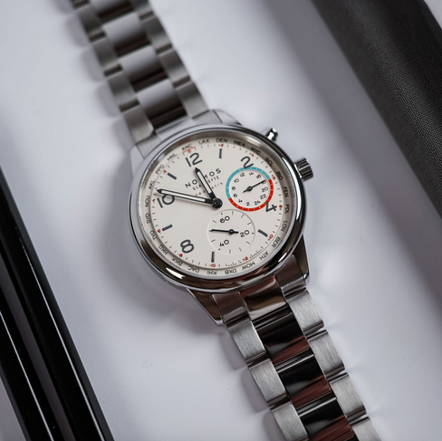 The timepiece is accompanied by a 3-link stainless steel bracelet featuring polished central links and satin-brushed outer links. In contrast to the highly polished case, the brushed surface on the outer links is a pragmatic choice to mitigate the unavoidable scratches of daily use. The Nomos Club Sport Neomatik Worldtimer Radiant White is priced at EUR 4,260, or EUR 4,080 with a grey textile strap option. Additional details can be found at nomos-glashuette.com.