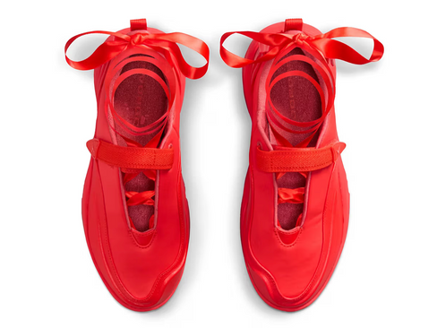 The design explicitly references the ballet shoe, with conventional ribbon lacing that encircles the foot for a secure, dancer-like fit. Nonetheless, the refined top contrasts with a robust, fashion-forward thick outsole that anchors the shoe inside modern sneaker culture. A Velcro strap provides extra support and enhances the technical design, ensuring the appearance does not seem overly costume-like.