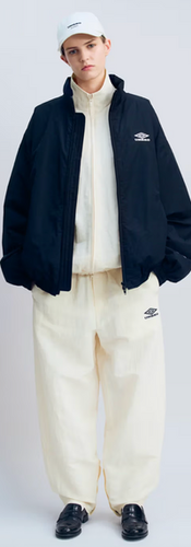 The collection consists of eight pieces, made from a nylon-cotton dump fabric and a water-repellent linen-nylon woven fabric. Essential products comprise track jackets and coordinating track pants, padded jackets, wide jeans constructed from vintage denim, high-gauge fleece tops, and caps fashioned from Italian OLMETEX twill.